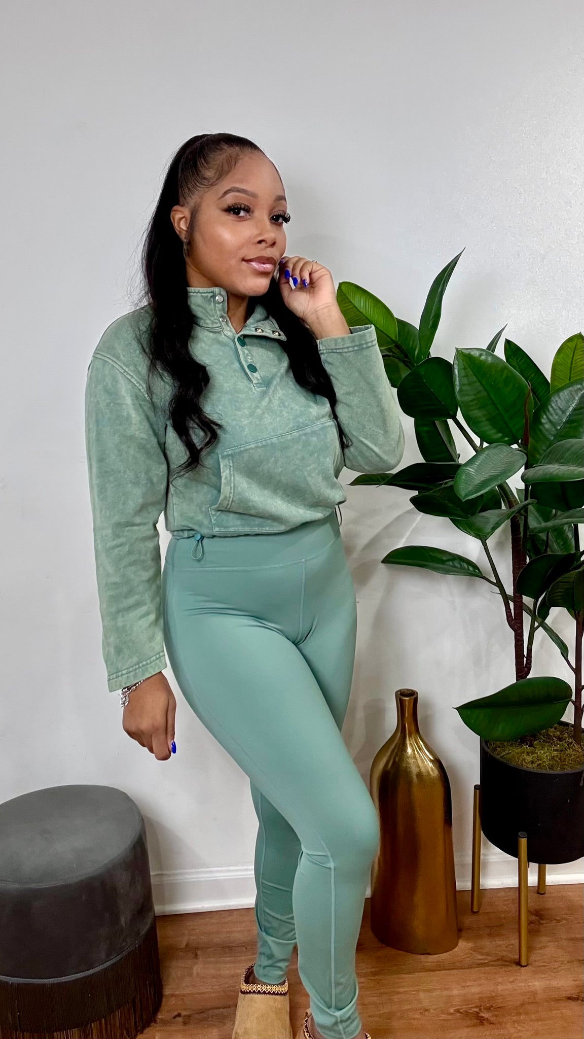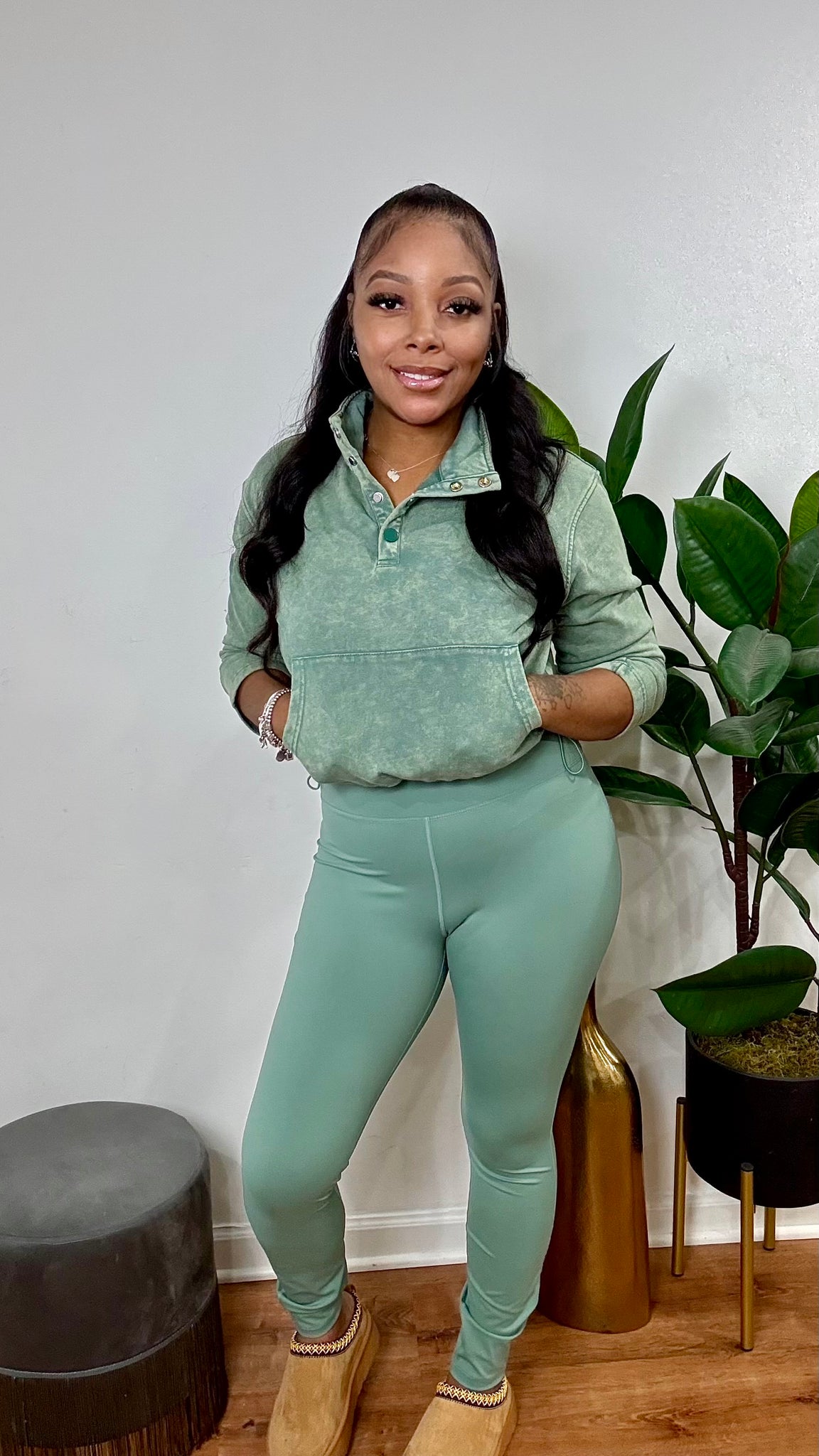 Pullover sweatshirt featuring buttons and a drawstring waist for a cinched look, and stretchy high waisted leggings. This set is the perfect balance of functionality and style. Dare to push the limits with this must-have set!